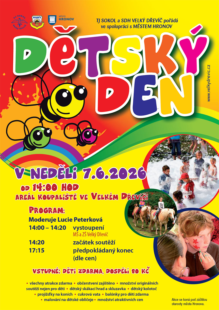 Dětský den ve Velkém Dřevíči se uskuteční v neděli 7. 6. 2026. Přijďte si užít s vašimi nejmenšími množství originálních soutěží a skvělých odměn, skákací hrad, skluzavku, kolotoč, projížďky na koních, malování na obličej, balónky, cukrovou vatu, občerstvení nebo třeba vystoupení dětí z MŠ a ZŠ Velký Dřevíč.